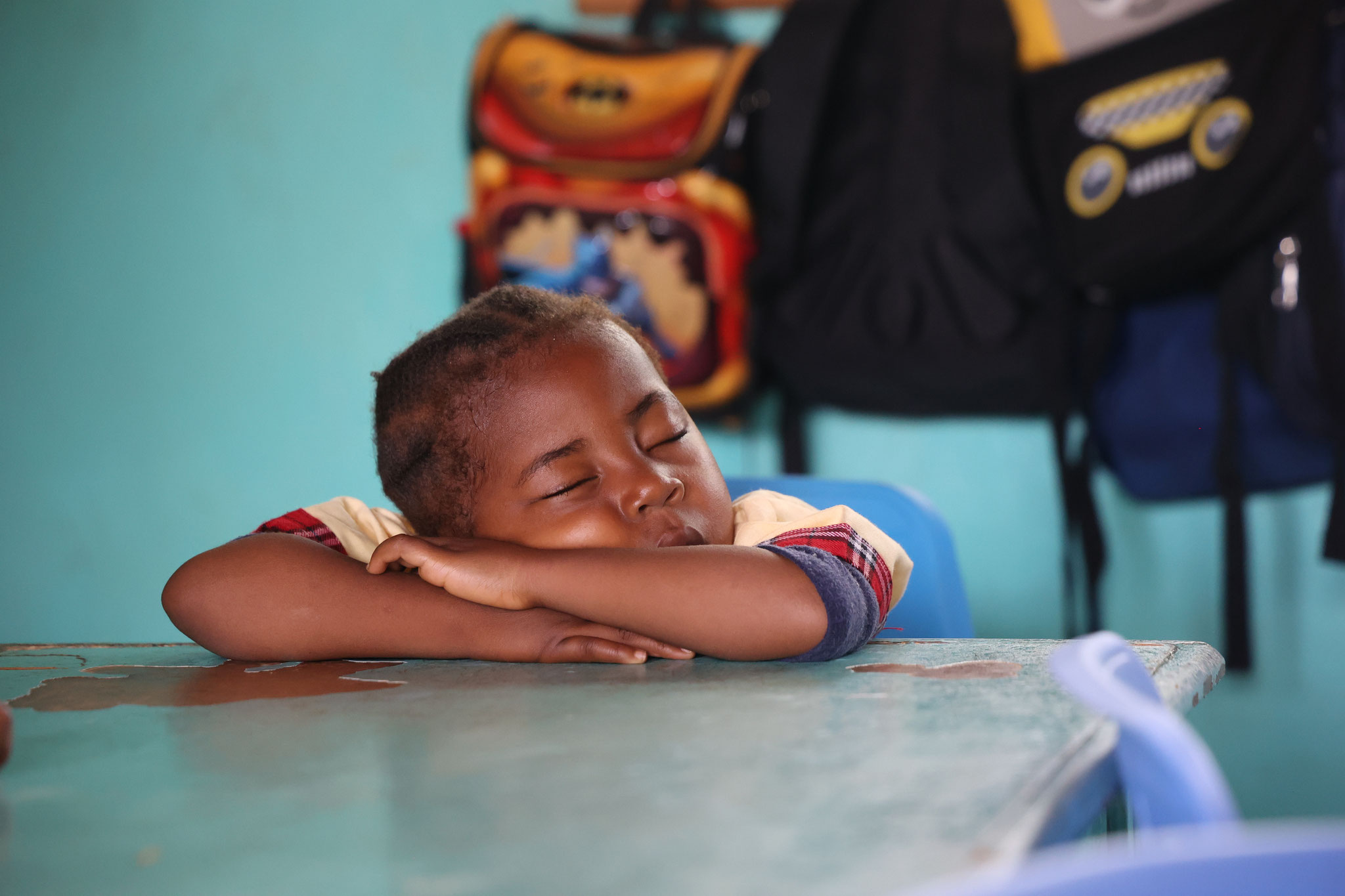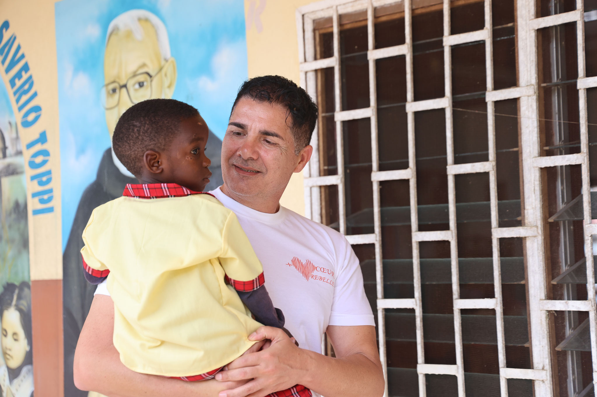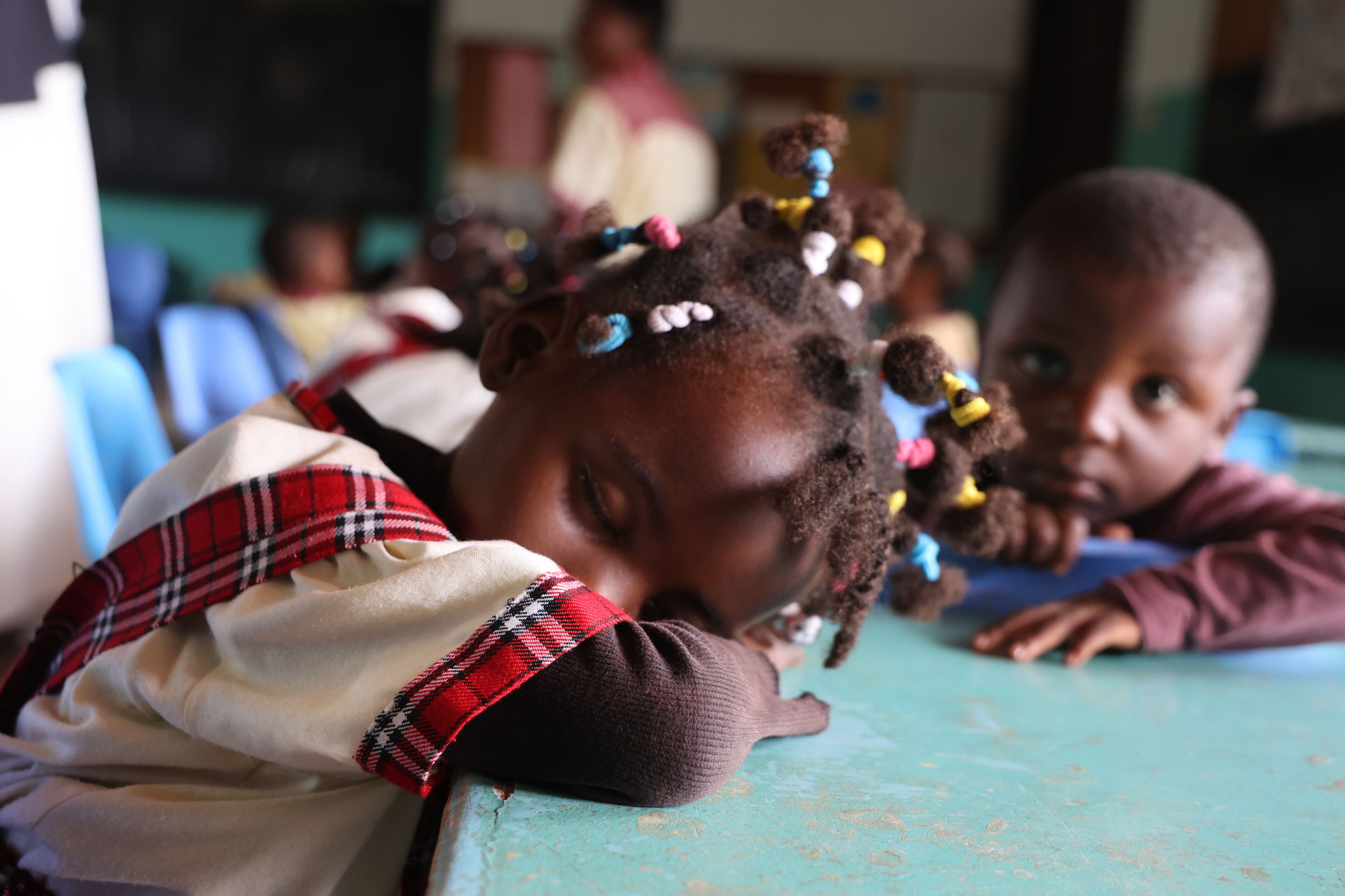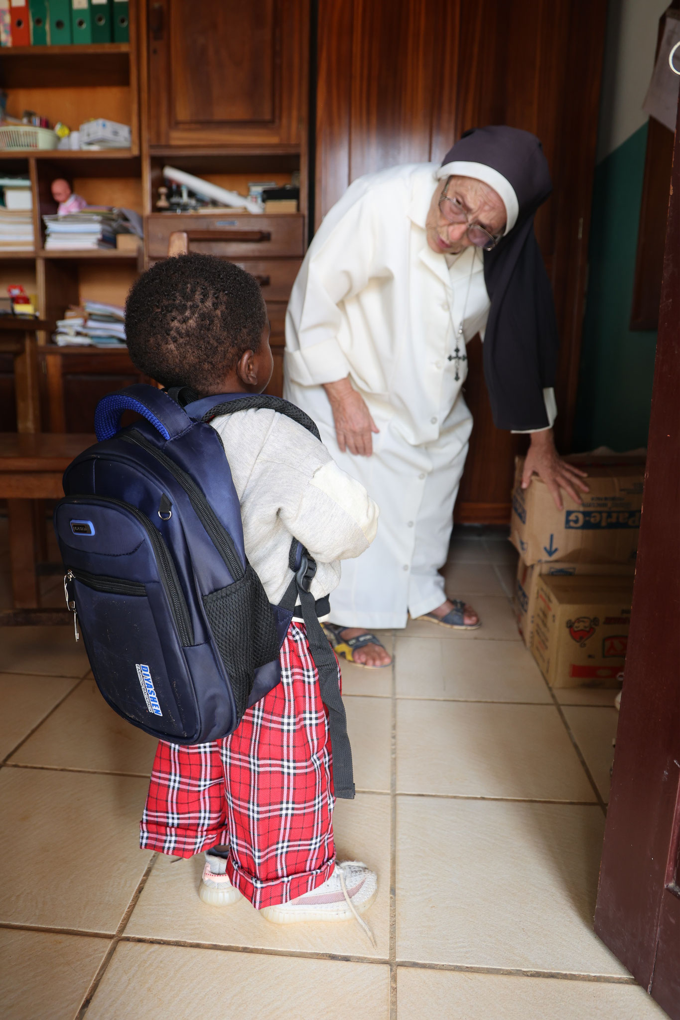 Quando entriamo nelle classi è l’ora del riposino: i piccoli dormono con la testa appoggiata al banco, qualcuno sbircia di sottecchi. Gabriel trascina uno zaino più grande di lui, ha un succo in una busta che morde con i denti e gli cola addosso. Suor Sabina lo asciuga con la dolcezza di una madre.