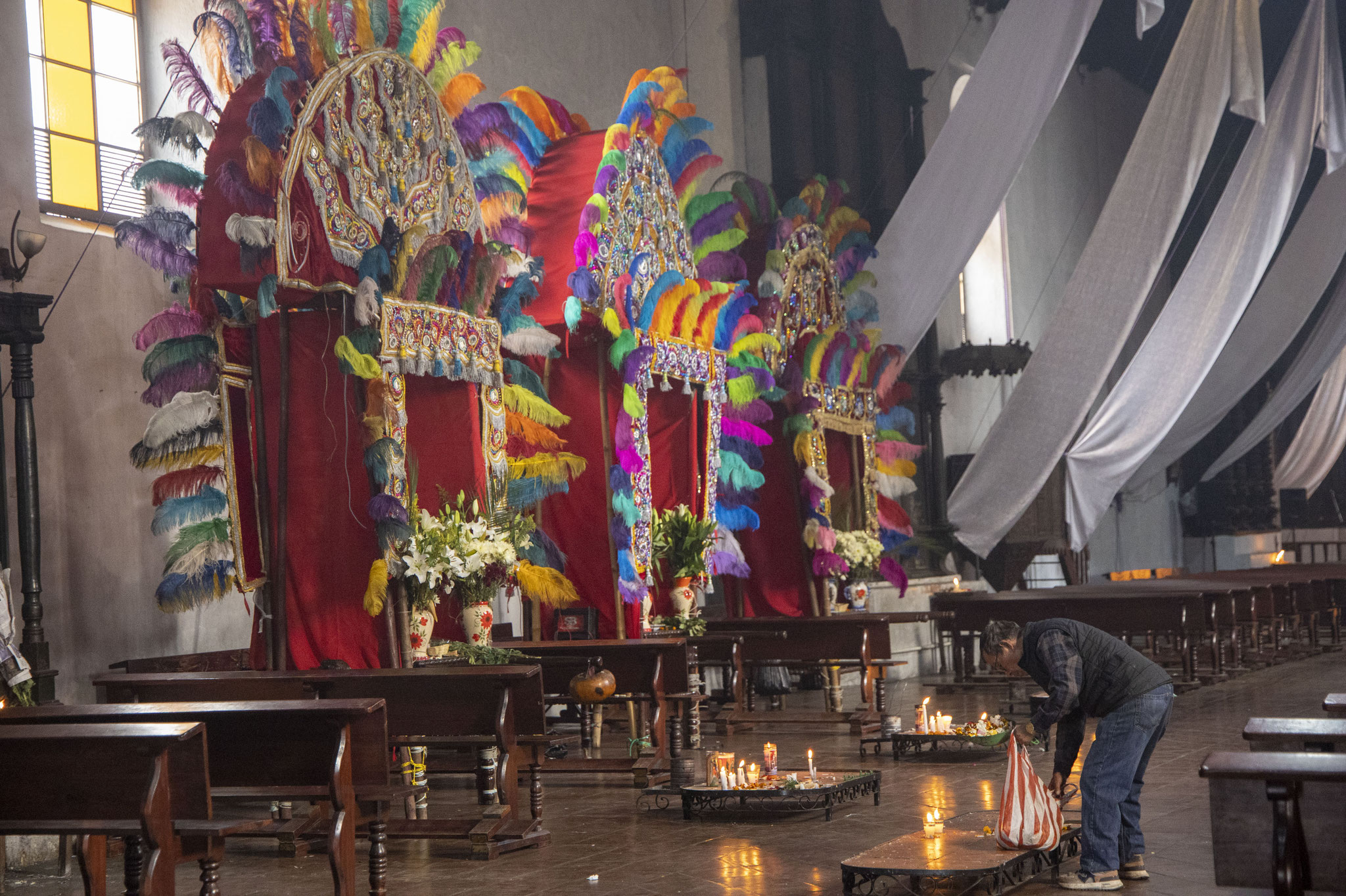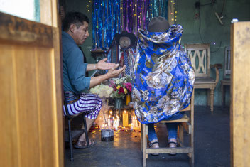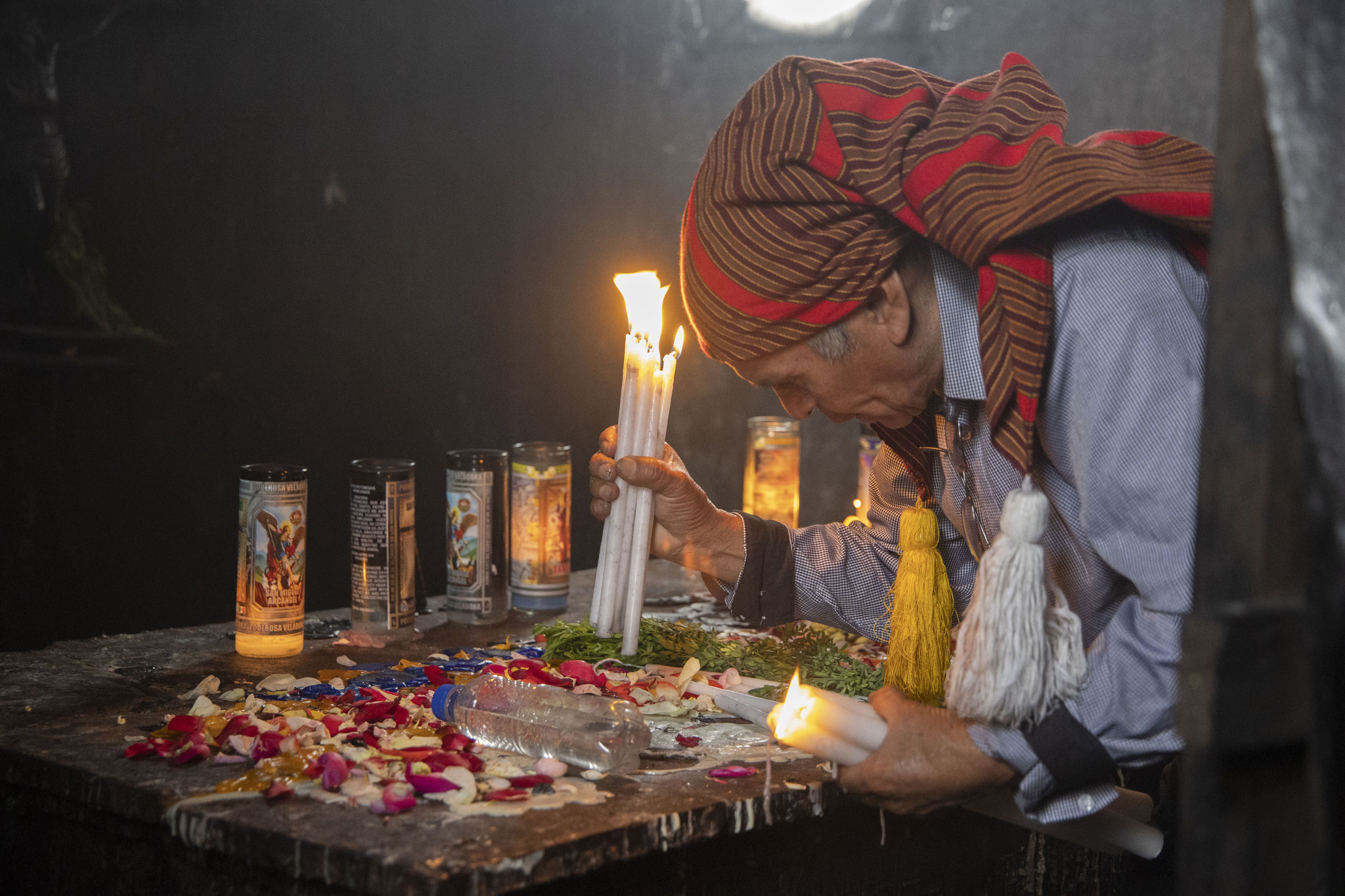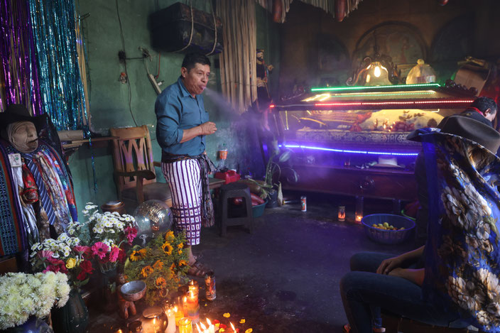 Un sincretismo tra tradizioni Maya e cattoliche che ha fatto nascere anche credenze bizzarre. A Santiago Atitlán ha dato vita alla devozione di figure come Maxscimon, un "santo" molto particolare non riconosciuto dalla chiesa cattolica, Il suo corpo di legno è posato su una stuoia di paglia, vestito con abito elegante, cravatta e cappello. Maxscimon è venerato in case private dove viene ospitato a rotazione annuale da confraternite locali. Viene accudito 24 ore su 24 da due persone, il cui lavoro è di servirlo a tempo pieno, parlano con lui in un dialetto locale. La stanza che lo ospita è un luogo in cui si mescola il sacro al profano. Le pareti sono infatti straboccanti di figure religiose come quelle di Gesù Cristo e di santi della religione cattolica. Candele e incenso bruciano ovunque. Il soffitto è coperto da palloncini e luci, i muri sono decorati con carta colorata, nastri, perline. L’atmosfera è decisamente misteriosa. Arrivo mentre è in corso un rito di purificazione di una donna.