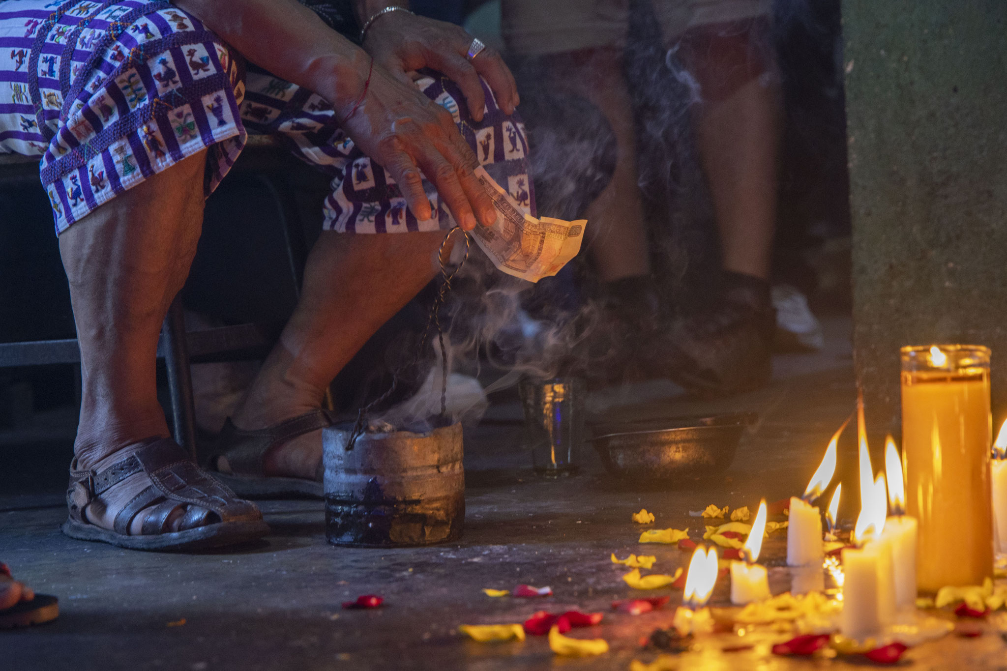 Lo sciamano prega mischiando litanie cristiane a frasi in lingua maya, offre a Maxscimon alcool, Coca Cola e sigarette. Il liquore viene versato direttamente nella bocca. Agita banconote, prega, beve, sussurra. Il rito si conclude con lo sciamano che soffia del rum sulla ragazza, il liquido spruzzato sigilla le suppliche della donna. La rincontrerò all’uscita del mercato dei fiori, mentre con un mazzo di rose in mano entra in chiesa per affidarsi a qualche Santo. Della serie meglio provarci con due.
